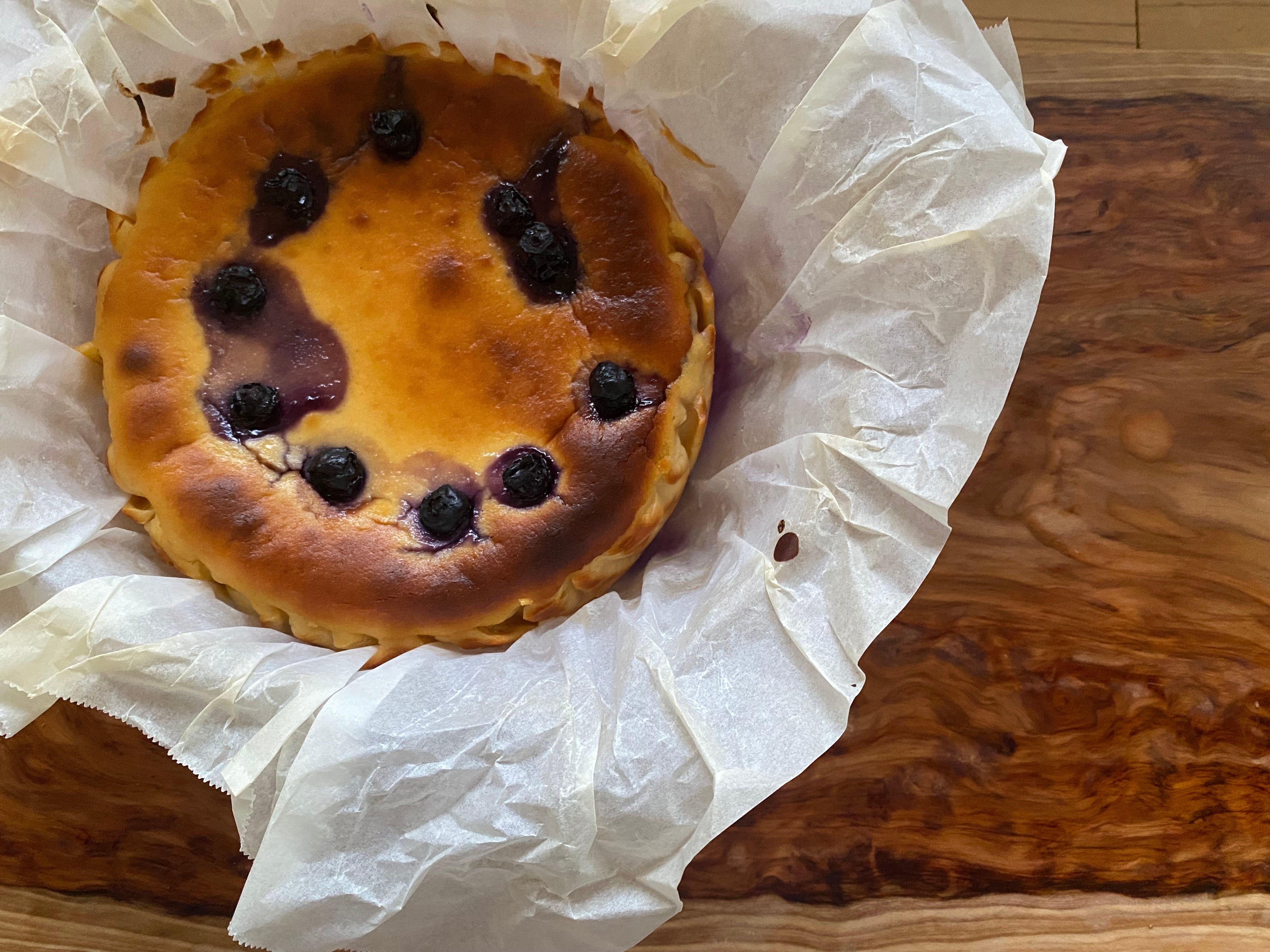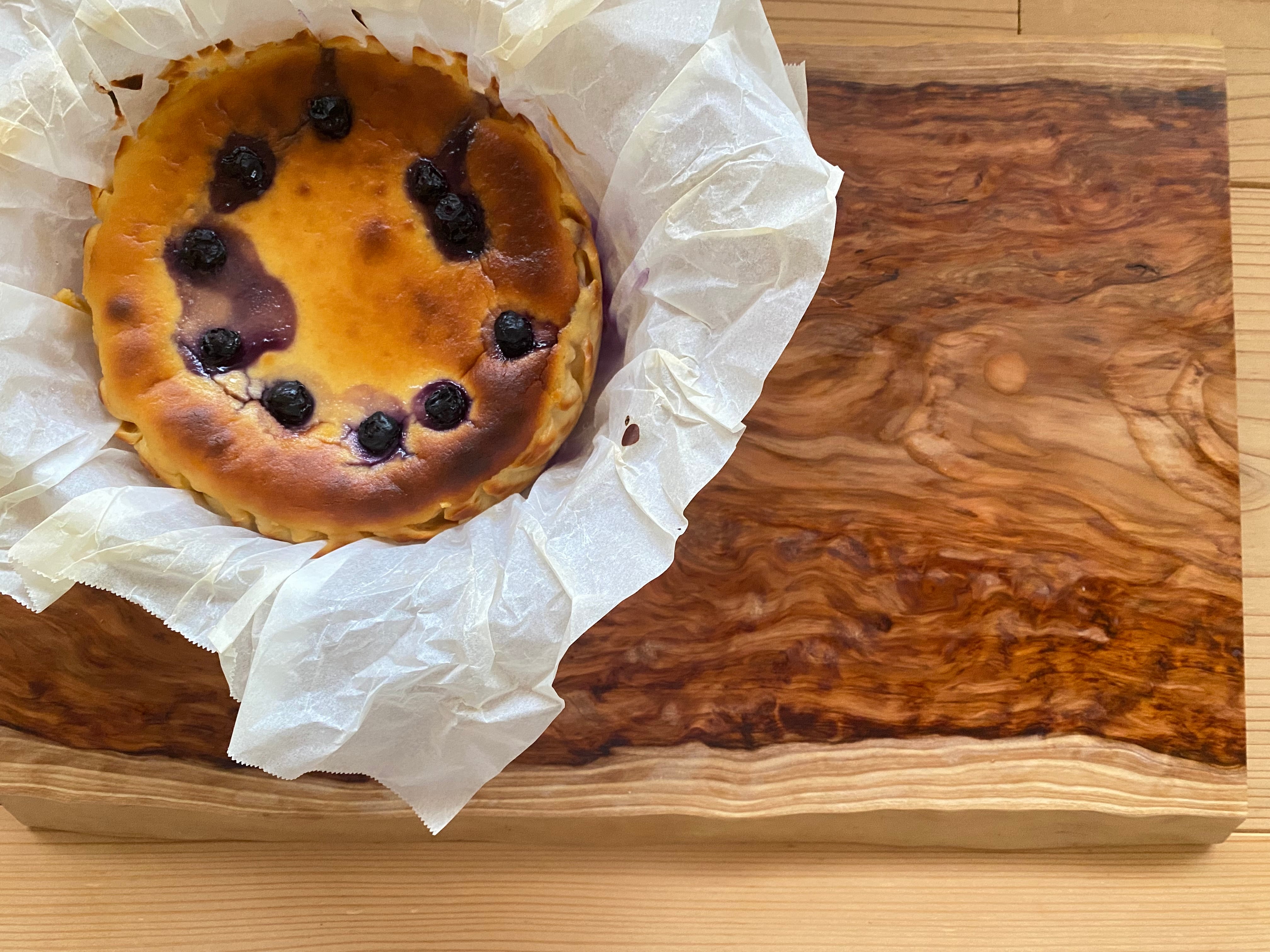 甘いさつまいもを裏漉ししてたっぷりと混ぜ込んだ生地にブルーベリーがアクセントになる様バランスよく入れたバスクチーズケーキ。愛媛の山奥、久万高原町の古民家で素材の味を活かす様、ひとつひとつ丁寧に手作りした素朴なケーキです。